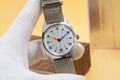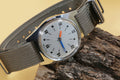 The first thing you’ll notice is the striking contrast: a sleek, brushed silver dial punctuated by bold orange and blue hands. It’s a playful yet sophisticated nod to retro aviation gauges, finished with a rugged olive nylon strap that adds a utilitarian edge.